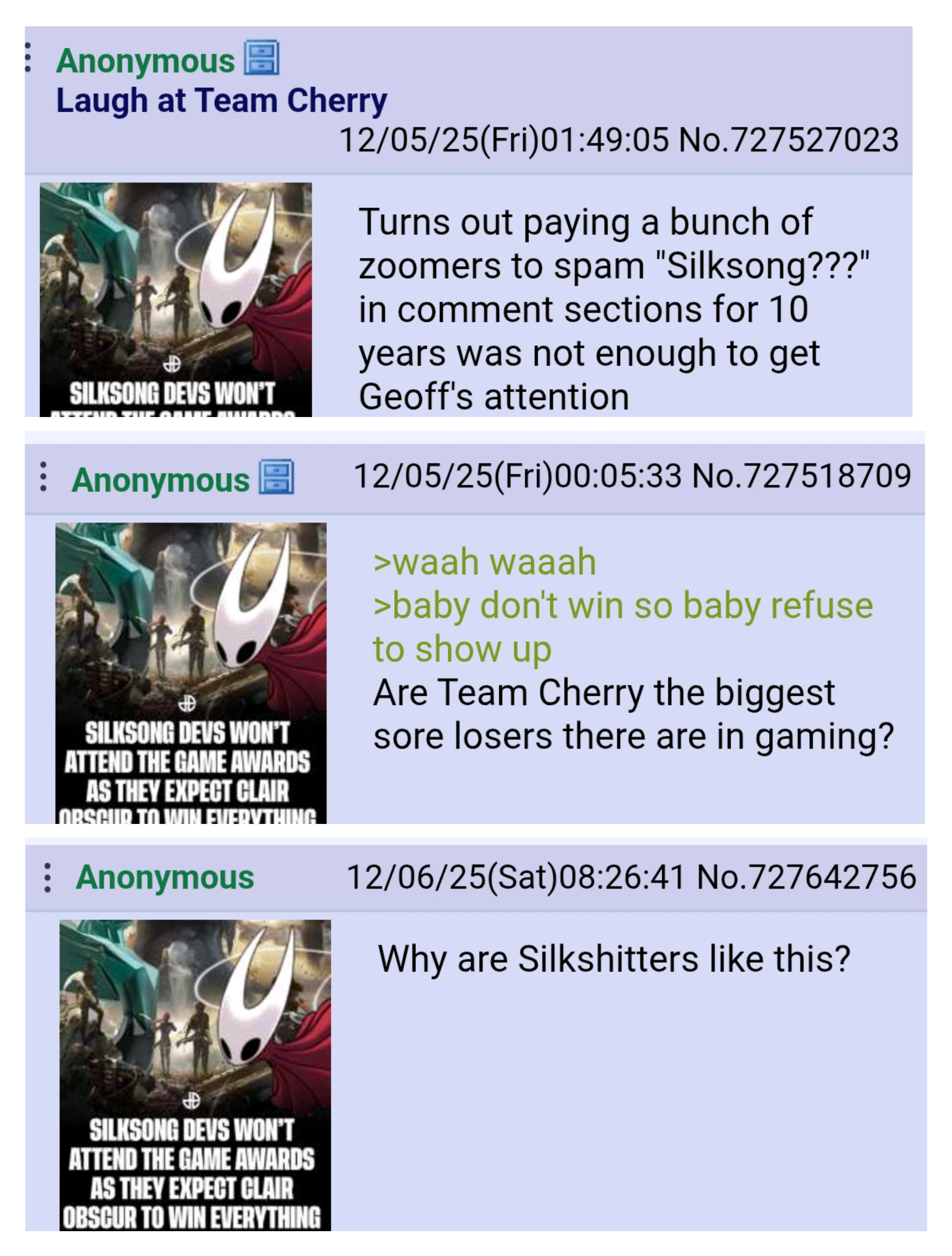 >>727642756>indie games never won goty>silksong made the industry mad with its difficulty and $20 price>tga is one big corrupt award showwhy would any sane dev bother going? especially after they snubbed pizza tower to give the DEBUT indie game award to a guy's third game. silksong will win some irrelevant side awards while e33 will win goty because it's the industry darling.the tga needs silksong more than silksong needs the tga