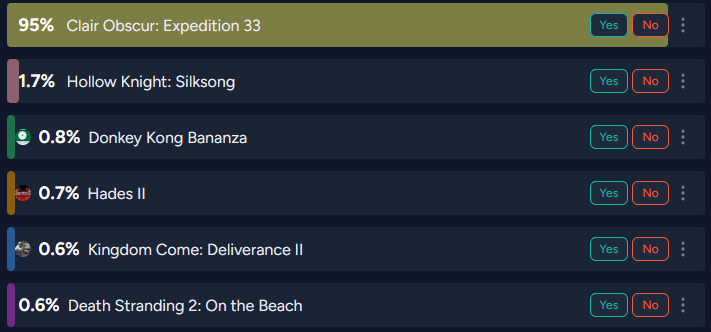 Fuck e33. Vote for arc raiders. Shroud and jackfrags are right. It's goty and has wholesome gameplay