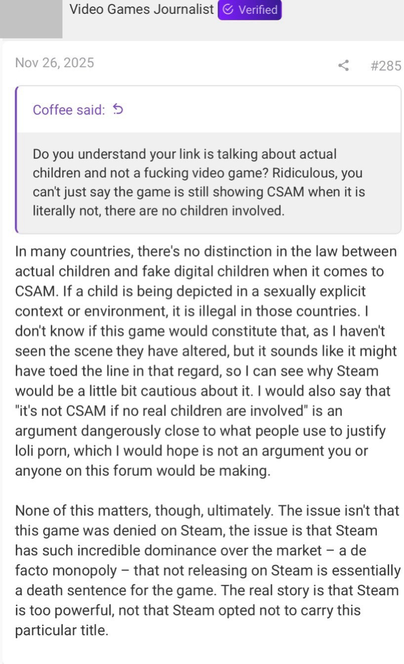 >>727672747>>727672872More interesting is that the girl doesn't actually exist in the game. She was shown in initial previews months ago, however in the final game she's aged up some 20 years.This is why Humble put the game back up after briefly taking it down, and it's why it was so weird that Epic decided to take down the game right before launch, where as the Steam ban was based on this scene still being in the game even though it wasn't.Essentially this means that Humble and GOG were the only ones who actually played the damn game.