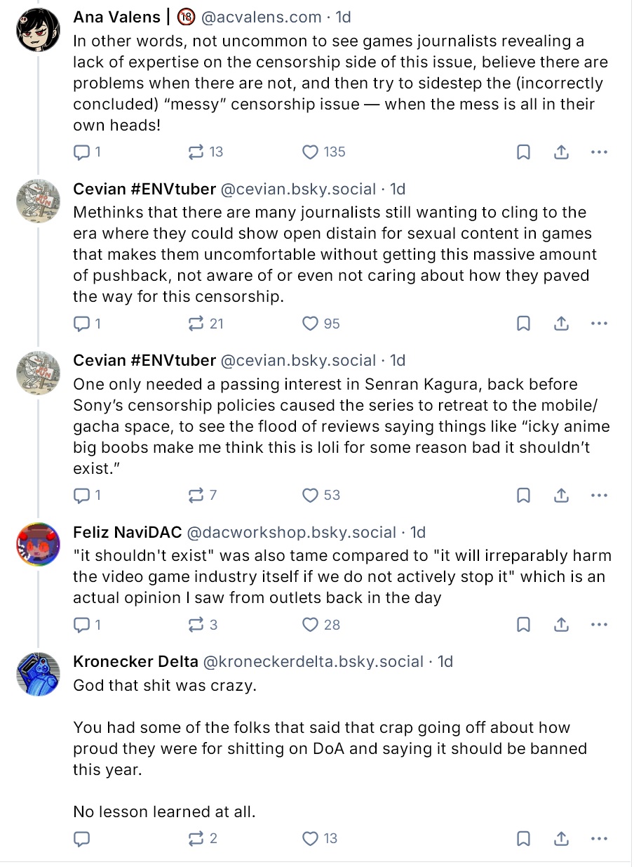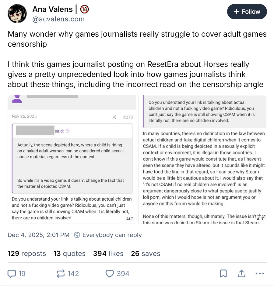>>727653731>Will games media who fervently covered the Horses situation cover this too?Tons of journos won't even fight for Horses. Many support its ban even. They aren't touching the icky anime titty game.