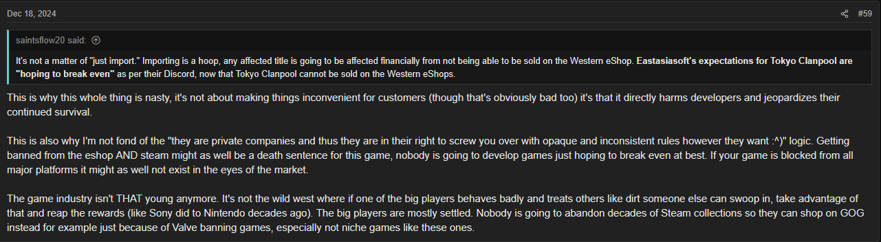 >>727670650The big platforms cave in to outside pressure easily because they've got so much to lose if someone like Visa were to stop working with themVisa doesn't need to actually stop working with Steam, or even directly state anything themselves, there just needs to be enough of an implication that something like that might possibly may be happening for example from a third party activist groupWhere as if a publisher puts up their own website or they're a small enough storefront, then they don't need to cave in to third party pressure. The only way Visa stops working with Mangagamer for example is if Visa themselves makes that decision, but that would put Visa completely legally liable for that decision which opens them up for lawsuits. After all, there's no restrictions on buying regular porn or dragon dildos from a real physical porn store or even online sex shops. I can pay for a fucking hooker with a Visa these days. Visa implicitly banning just "sexual content in video games" has no legal basis and thus they'd likely lose in court. But the intersection between "able to give up on Visa access for the duration of a lawsuit" and "have enough money to fight Visa in court" is basically non-existent.