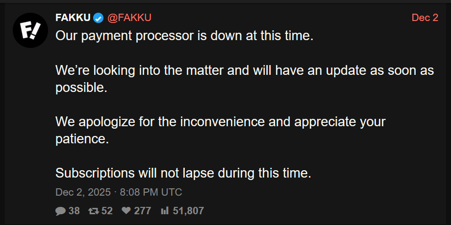 >>727669998They announced they started having issues with their payment processors a few days ago. Soon after, people started reporting content and tags being hidden or missing, only being accessible by direct link if at all, including from their own libraries. Basically the same story as itch.io. This user is chronicling what's going on.https://xcancel.com/acvalensVT/status/1995879376379076896#m