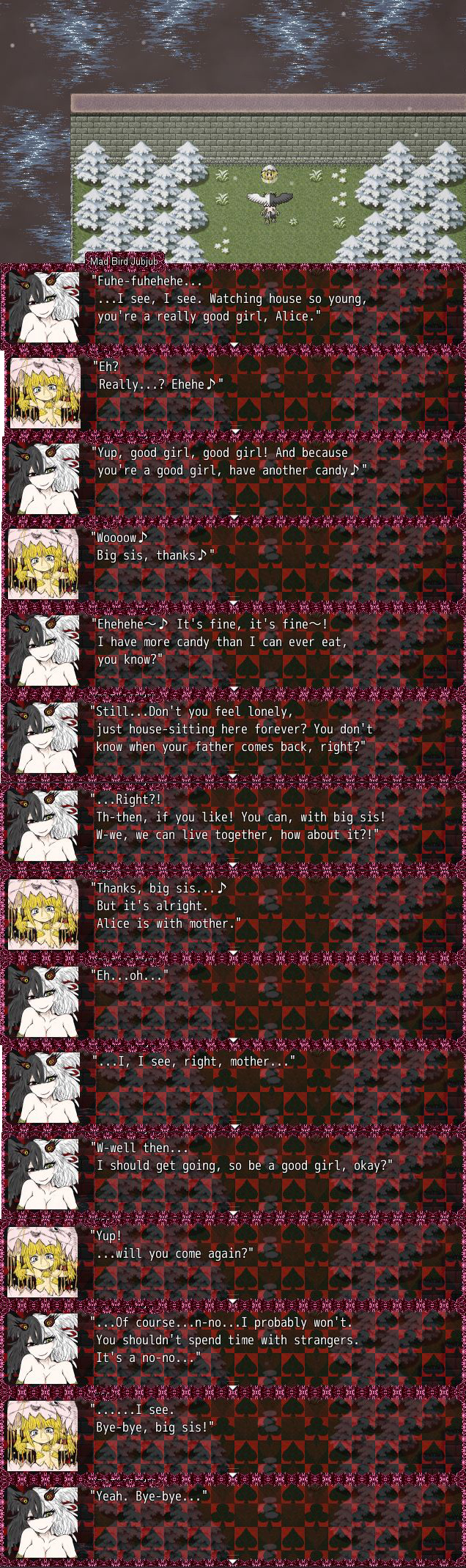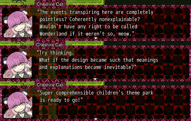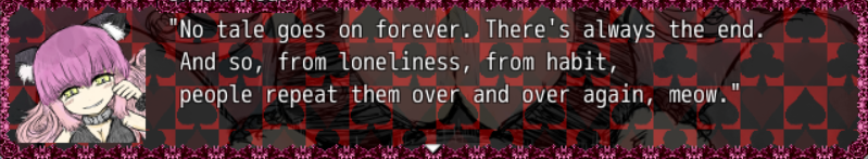 >>727678706>expecting it to be this epic story about the human conditionThe game doesn't have any grand message a la Dostoevsky, and it doesn't aspire to have one in the first place. It's meant to be an entertaining story, you shouldn't expect philosophy out of genre fiction. >nonsensical story and obtuse / random bullshit that makes no senseJust like Alice in Wonderland. Though only ostensibly, by the time you finish ending G the overarching plot should be visible. Everything you see in the came is self-consistent and has wonderful parallels with the source material. The "Lorina was in love with Dodgson" and "Dodgson was courting the Liddells' governess" theories are both present in the game. >the dissonance of you meant to be sad for grimm while hes raping children shoved down your throat every 30 minutes is just insane.Lolita wants you to feel at least some sort of kinship with Humbert. Crime & Punishment asks you to feel sorry for a murderer. Berlin Alexanderplatz wants you to empathise with a pimp+cuckold, murderer and rapist all mashed into one.The game passes no judgment on the main character until a certain hidden scene the Hotel revisit in the underwater area, where the main character practically crumbles out of guilt, and it doesn't pass any judgment on the player because doing so is cheap writing (see Undertale). The game expects the player to feel repulsed, and achieves it through the rough art style and careful word choice. The depiction is naturalistic, not moralistic/sentimental. Do you get angry too when the narrator in Madame Bovary doesn't say anything about her exploits?And all this rape is just setup for the twists anyway. Both BS1 ending C and BS2 ending G reveal that everything is not as it seems.
