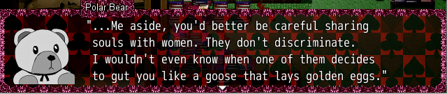 >>727725467He pretty much tells you.A soul stuffed into a bear to be the role of a merchant