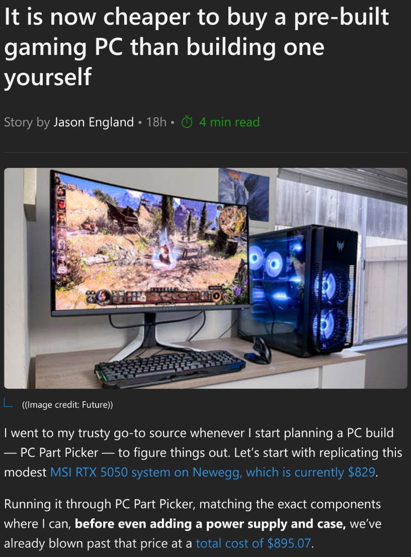 >>727667297>nowFucking retard article. Genuinely fucking retard idiot that only looks at Dell or their favorite ecelebs rip off company.A prebuilt is generally 100-200 cheaper than buying individual parts.