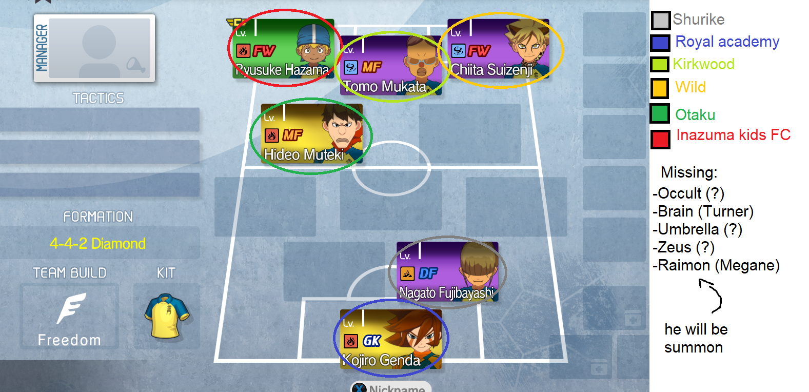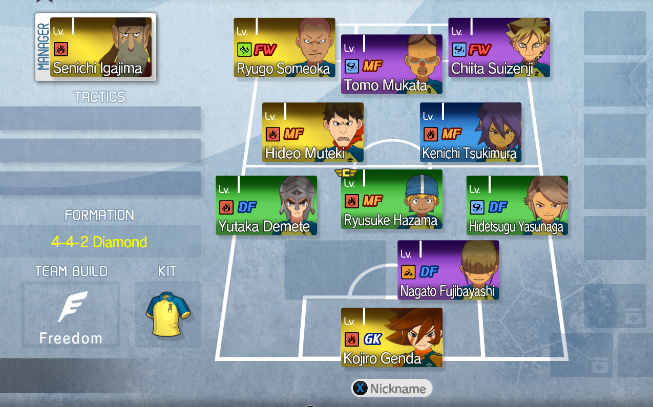 Here is how the Inazuma C is lookingOnly missing the Brain player and then ill fix the formationI hope something like the chicken incident happens again ha-hahah