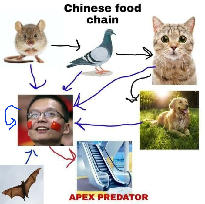 >>727695419Chinese mice eat pigeons and those pigeons in turn eat cats which eat dogs???