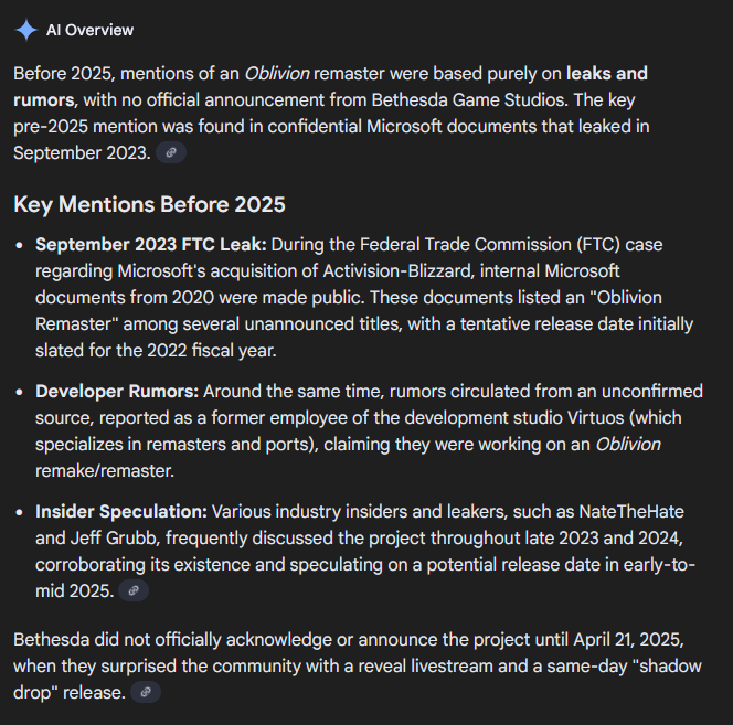 >>727702401>And we also knew Oblivion Remastered was a thing for at least a year prior. It was the worst kept secret in gaming.No it was not. Noone knew that until it got 1-2 weeks at most before being shipped.