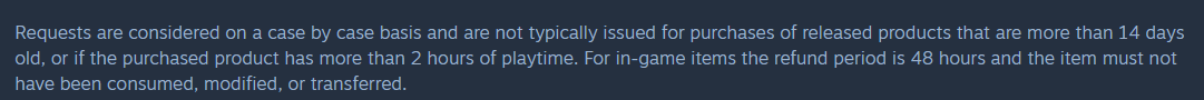In the past, I have found that Valve is very lenient with their refund policy so long as I have not played a game for longer than 2 hours. On the 1st of November, I bought and played a shitty early access game a friend recommended to me and accrued about 20 minutes of playtime. Yesterday, I requested a refund. This is my first time EVER getting a refund rejected. Their reasoning was that it was outside the 2 week window, but I've done successful refunds on games I bought several months in the past. This policy would be understandable if this was a new account, but my account is about 20 years old, not to mention I spend hundreds on Steam each year. Has Valve recently changed how lenient they are on refunds? This will honestly impact my buying habits on Steam, I used to take a chance on games knowing that I could do a "sweep" later and refund the ones I didn't like. If they're going to start being more anal about the 2 week window then I'm just not going to purchase games that I don't plan to immediately play.