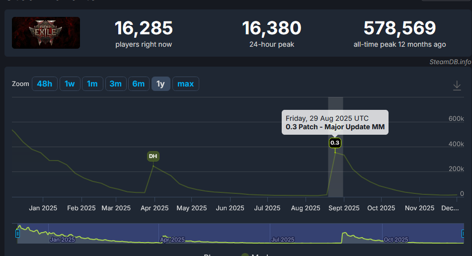 >>727729339What I meant by that was a 4 month cycle live service game. You're going to have worse retention in 2 then 1 because there's basically 2 builds to play every league and you'll do everything you want to do in the first week. You already see it with the steam charts.