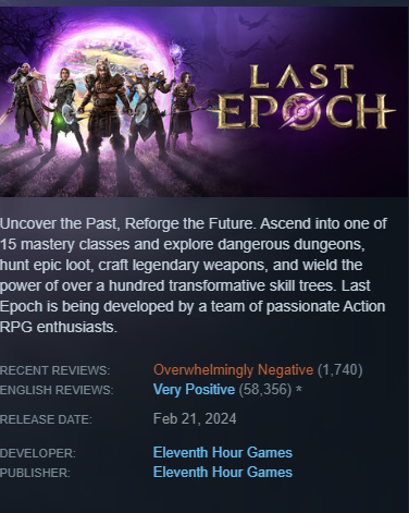 >>727714936>Last Epoch is a paid game in a genre dominated by F2P PoE>Devs promise no paid content after the buy-in to play, everything would be free outside of a cosmetic shops>Devs sell out to new publisher Krafton>Devs say cosmetics not enough to support future development>Announce that new expansion will be free, but future classes will be payment-required>Review bombPeople act like the devs stuck a knife in their backs but really the "no payments again ever" thing is a platitude that only works if the game is a runaway success, which it wasn't.