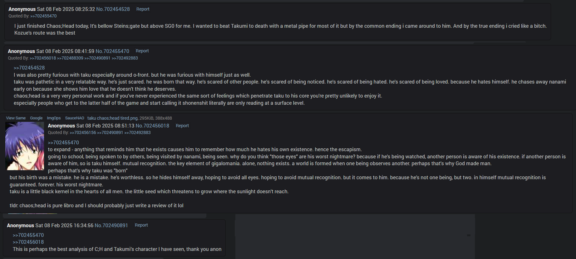 >>727745412>>727746069I think part of it depends upon how well you can relate to taku himselfalso frankly I liked a lot of the general writing too but that's because I'm an otaku who loves stuff from this eraeither way it's not common for a protagonist in anime/manga/VNs to be far and away the greatest character in his story but Taku is absolutely a case of that. if you don't love taku (even though he's a despicable creature) you'll never be able to love C;H