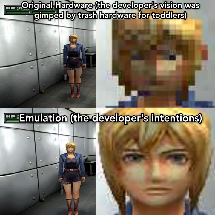>>727744110>upscaled modelsLooks a bit worse to me IMO, I think PS1 games look better at the default resolution because it hides some of the rough edges.