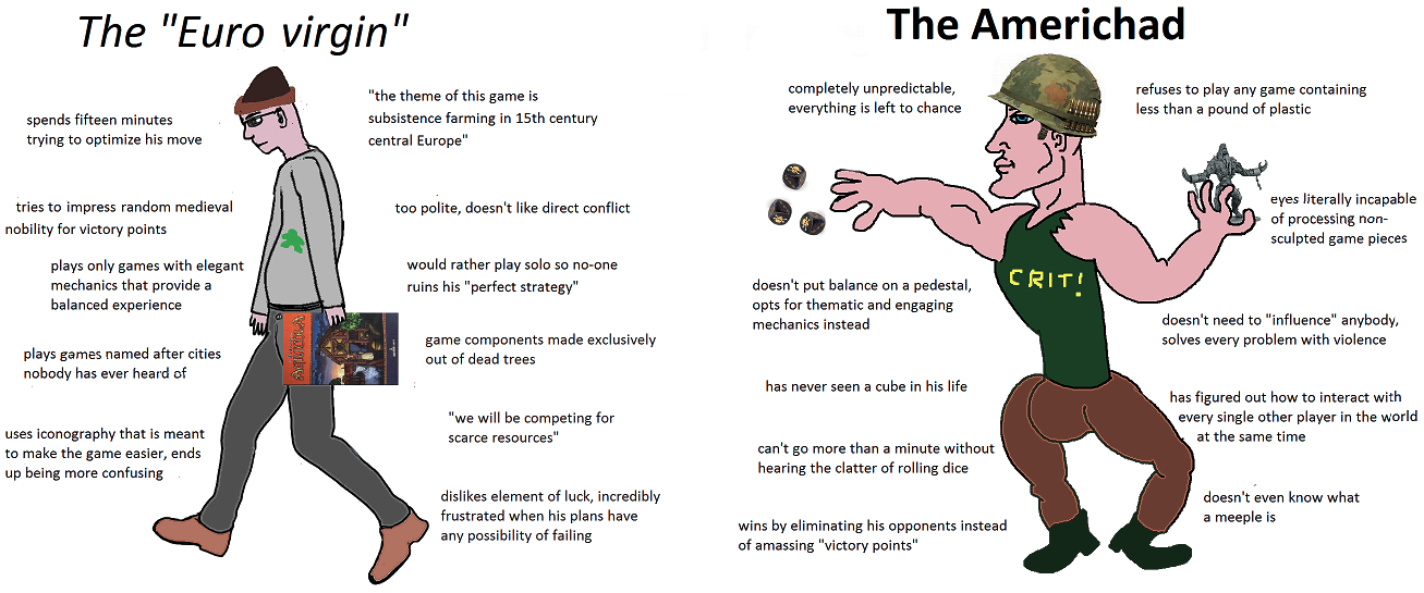 >>727761195Basically the same difference as american board games vs american euro games.