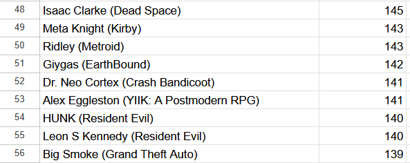 >>727808637In 2022, Doomguy received 277 votes. Phoenix Wright and Vergil received more votes that same year than our 2025 top seed. But it is indeed the highest since then.