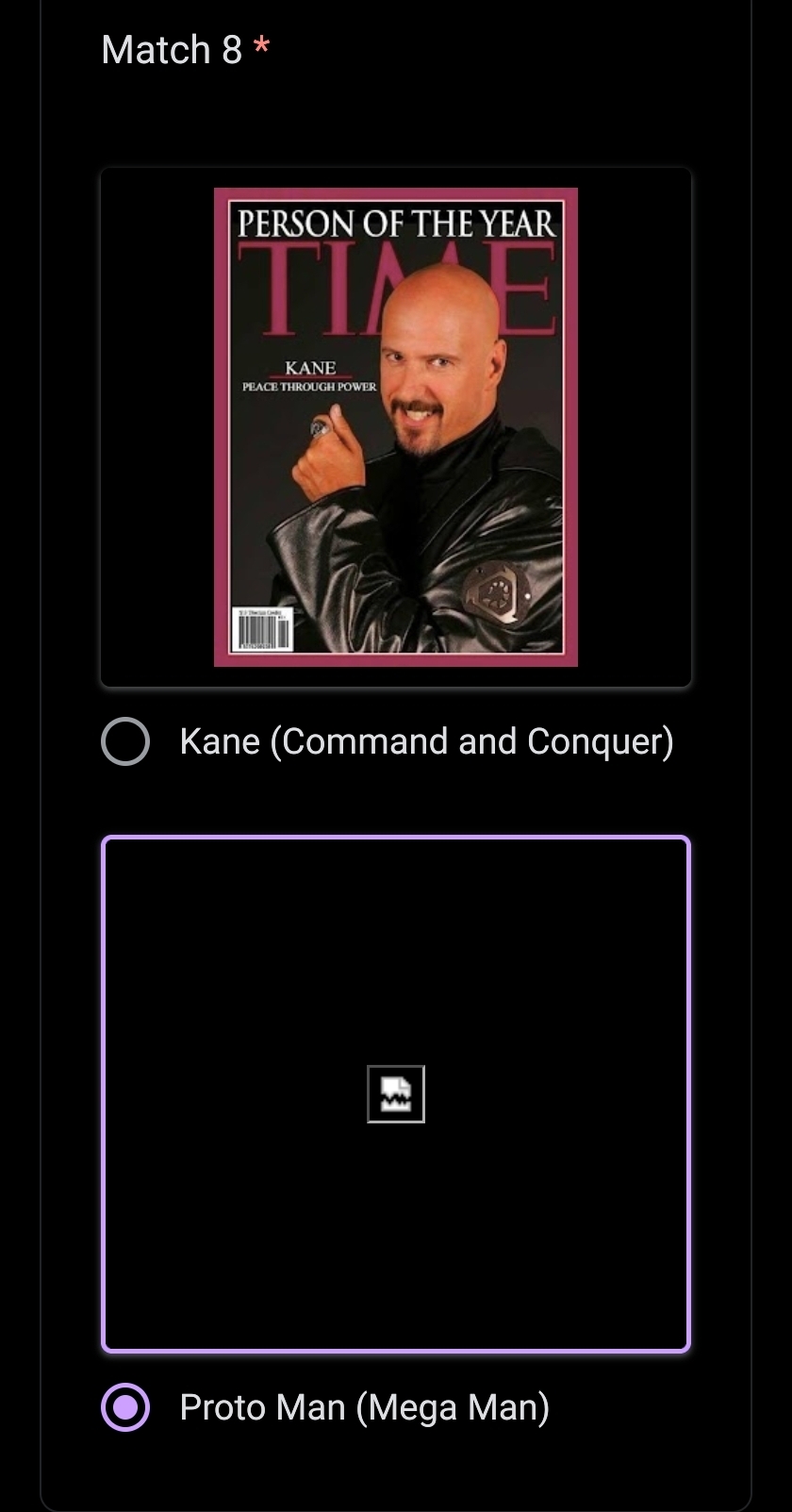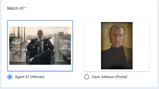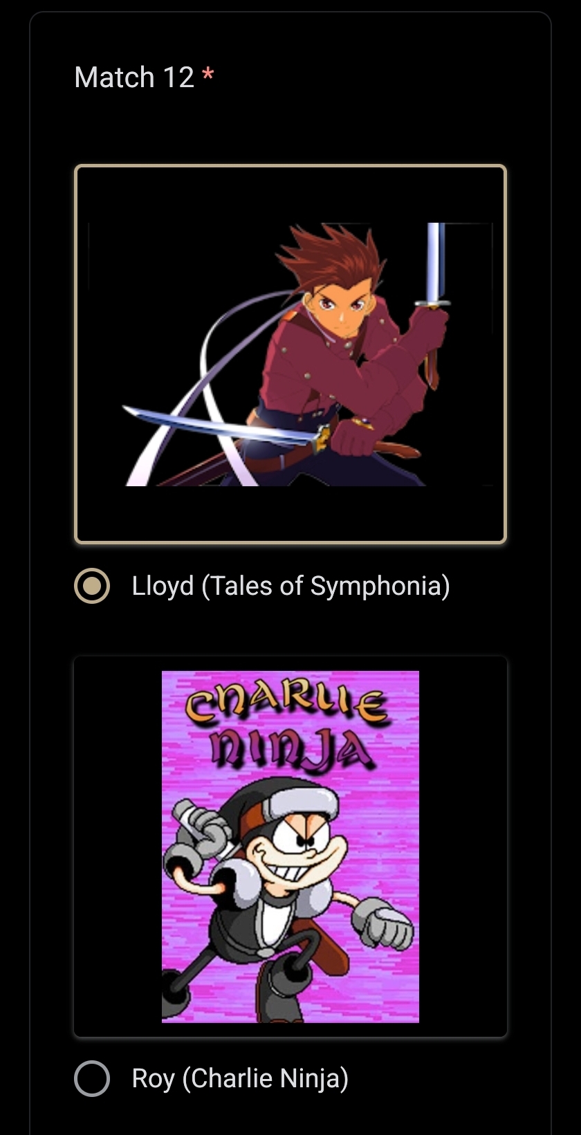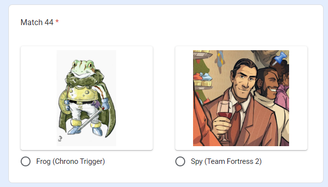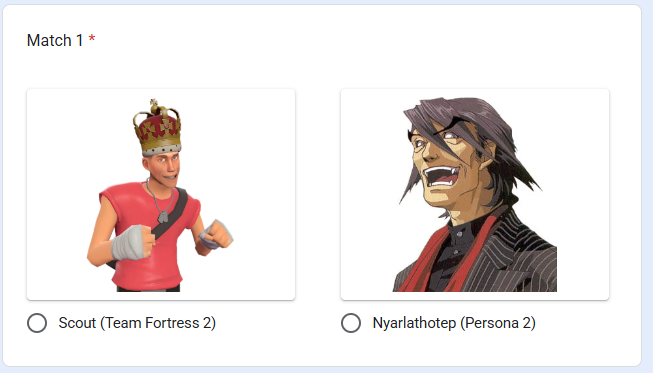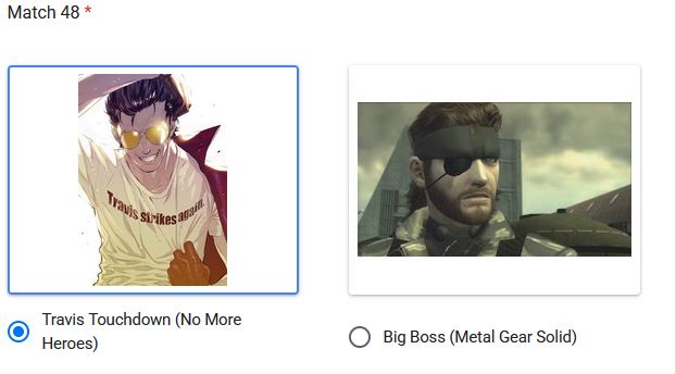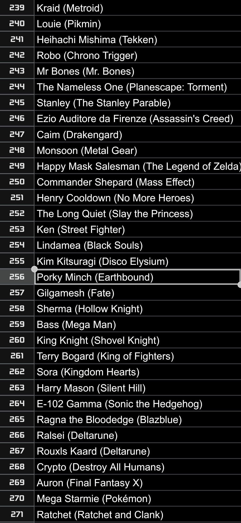 >Nyarly>Postal Dude>Freddy Fazbear>Rance>King of All Cosmos>Coach>Pepsiman>Kirby>Johnny Cage>Bowser>Vergil>Bomberman>King Dedede>AVGN>Ridley>Crash>Nahobino>Gex>Arthas>Alucard>Asura>King Harkinian>Real Kratos>Ryu>House>Dagoth Ur>Wily>DK>Regigigas>Olimar>Duke Nukem>Dead Weight>Sephiroth>Simon>Wario>Springtrap>Waluigi>(You)>The Knight>& Knuckles>Doomguy>Joshua>Agent 47>Spy>Cacodemon>Ryu>John>Big Boss>Demi-fiend>G-man>Gordon>Albert>Eggman>Klonoa (Jack off was so trash I will never vote Jack Frost ever again)>Mega Man>Dracula>Chris>Frank>Charles>Issac>Max (Leon needs to be with Claire)>Sam>Yellow Ranger>QuoteHow are my picks?