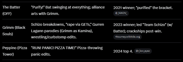 >>727831046King is actually a ton of fun if you can ignore the few schizos that show up or accept that the winners might not always be the best. A lot are able to revel in the chaos and the OC is definitely the best out of all the tournaments.