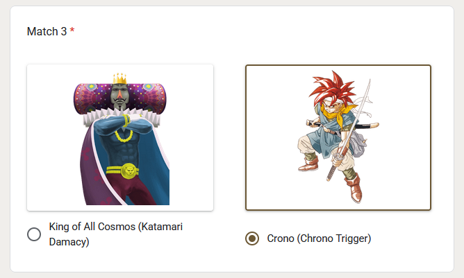 >>727895279Did someone say...LOSER'S BRACKET?I hope not, cause I can't bother to figure out how to include any losers past the first round.Anyways, our gracious corporate sponsors at Burger King® have helped fund the introduction of a brand-new side tournament, the Coper's Crown™ Bracket! 64 contestants who bowed out in the first round will duke it out for the chance at a...similar prize: an authentic Burger King® paper crown!Each round will end at around the same time as the main brackets, and hopefully, will begin around that time as well.Links for Round 1 can be found below:VOTE: https://forms.gle/hG18VuSn46oAnR5G8TIMER: https://www.tickcounter.com/countdown/8859151/end-of-round-1-of-the-burger-king-copers-crowntm-bracket