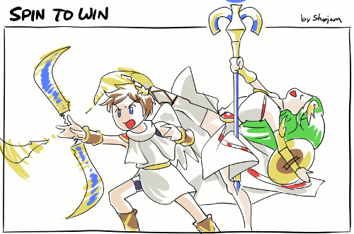 >All right, I won! Onto round two I go! It was a close fight, but managed to take it home!>>Close fight? That's not what I saw, Pit.>O-Oh? Whatever do you mean, Lady Palutena?>>Oh, I don't know. Does "Bomberman got trapped in a corner and blew himself up" sound familiar?>Hey, my maneuvering got him into that position!>>Whatever you say...>Well, I'm ready to fight anyone now! Bring it o-