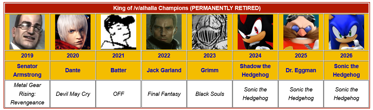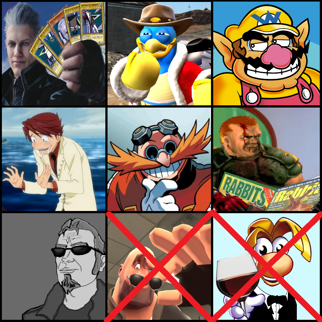 >>727895425E8 veterans remaining in each bracket division>Scout>Vergil>Kiryu>Edgeworth, Phoenix, Duke>Wario>Doomguy, John Ward, Travis>Demi-fiend, Wesker, Eggman, Jack Frost>Snake, Leon