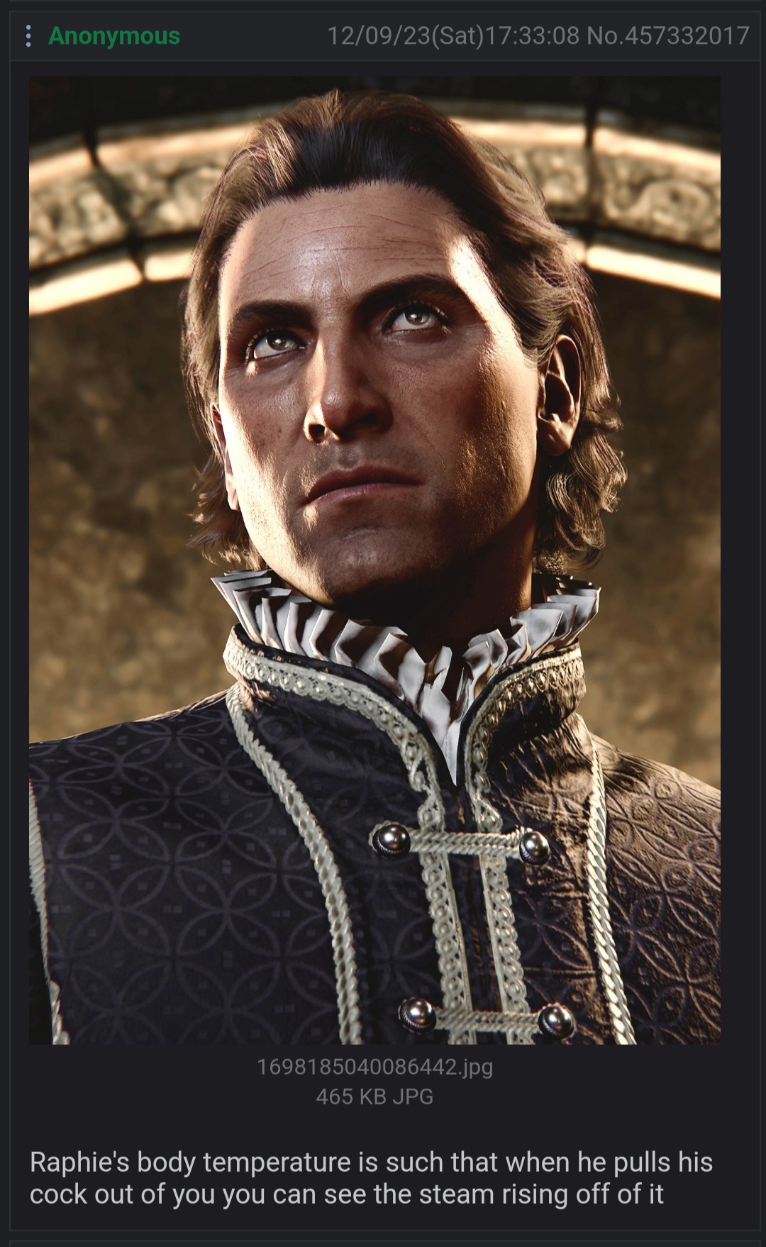 >>728366851Early Shadowheart Gate was the moment that exposed /v/ as majorly a cuckold community. You have no way to get a hint at Cuckoldry unless you are consciously and unconsciously seeking it. Same with Gay Gale. Even before the patch you can only get gay shit if you voluntarily agree to proceed with intimacy with him. /v/ exposed itself as the bunch of gays and cuckolds. That's why they hated bg3.