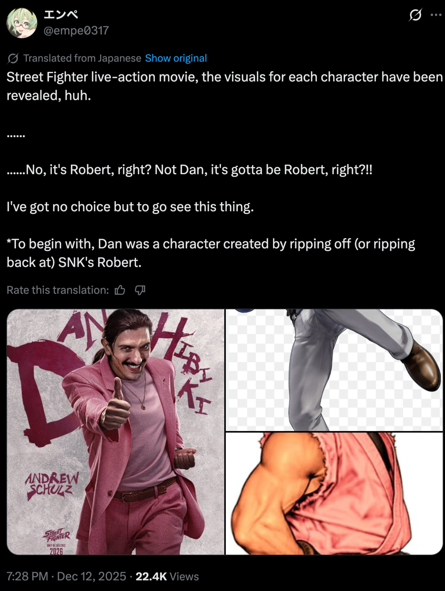 Honestly I wasn't expecting too much out of this, but the trailer made me think it kinda might actually work if they handle it right. If they don't take themselves seriously, but don't go too deep into reddit terroritory with the nudges and winks to the camera it might turn out to be a kinda fun cheesy dumb little action comedy. I am looking forward to seeing Cody Rhodes portray a lisping latino Guile. Jason Mamoa as Blanka could honestly be pretty great. Andrew Kojhi as Ryu is good casting. 50 cent as Balrog is hilarious. No idea who the guy they got to play Zangief is, but he nailed the look so I am hoping he can pull off the part. Hiroki Goto as E. Honda is fucking hilarious if you are a smart, and I am lowkey praying that GOATo finally gets his breakout moment after NJPW screwing him over for nearly 20 years. He genuinely deserves something good in his life and I know that if he breaks out as a movie star he will somehow find a way to get all his weird friends back in Japan involved in future movie projects he would work on. >>728325715Yeah Joe is sick of him, and the rest of the MMAsphere despises him. No idea how he got this role, because he doesn't work as the character and he doesn't have the personality to force it to work. He is incredibly stupid, has the charisma of a wet noodle, isn't funny, can't act, and can't fight for shit.