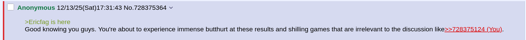 >Ericfag is hereGood knowing you guys. You're about to experience immense butthurt at these results and shilling games that are irrelevant to the discussion like>>728375124.
