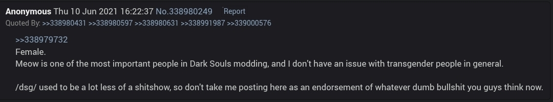 The dark souls fandom has become rotten now with troons. I am afraid that fromsoft's next actual single player game will be their last good game before they go completely off the rails trying to appeal to these troons who never should have been a part of the community. Oh well, all things must come to an end eventually.