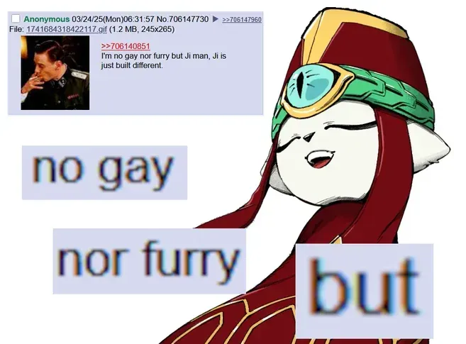 >>728506680Imagine if Chujin was actually like that. You walk up to him sitting down and he looks like a little wimpy twink, then he stands up, and instantly morphs into a seven foot tall gigachad.
