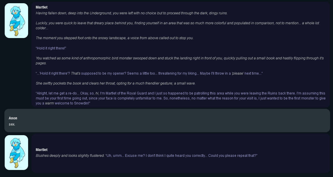 >>728539303Based anti-feminist Radiation. Deltarune also fails the Bechdel Test by having Susie and Noelle talking about Kris the one time they are alone.>>728540642Chujin is a good character to be an antagonist. Even Alphys would be a significant threat in Undertale if she could bring herself to hurt a human, and Chujin is much more competent and determined.>>728551364>live underground for years>eat and drink only magical monster food>with every skin cell or hair falling off, a little more physical matter is lost>what would be a normal human body becomes more "magical">over time, you notice more and more changes>even more intelligent monsters start having trouble noticing that you are a human>you have a "magic field" now or somesuch>this means monster rules start applying more and more to yourself>if you were attacked, intent would determine how hurt you would get>you start worrying about if you can even protect yourself if a malicious human comes through>maybe you might be able to learn to cast magic>but you also wonder what will happen when you die>will you fade away into dust, leaving only a skeleton behind?