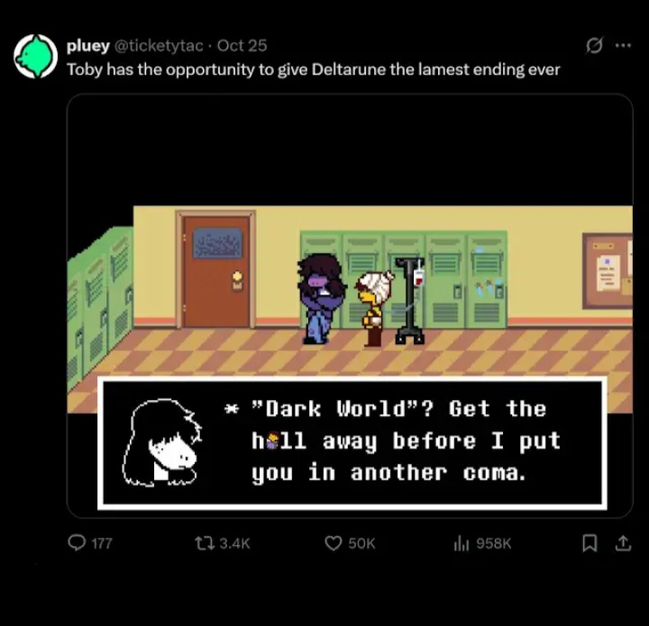 >>728509729>it's because everyone knows Toby doesn't give a shit about expanding the canon of Undertale and Deltarune beyond miniscule merch events which he loves to keep extremely vague because he hates confirming anythingI've come to appreciate this about Toby. I have a lot more fun writing Undertale lore than I do reading it. I do like Toby's character scenes though.