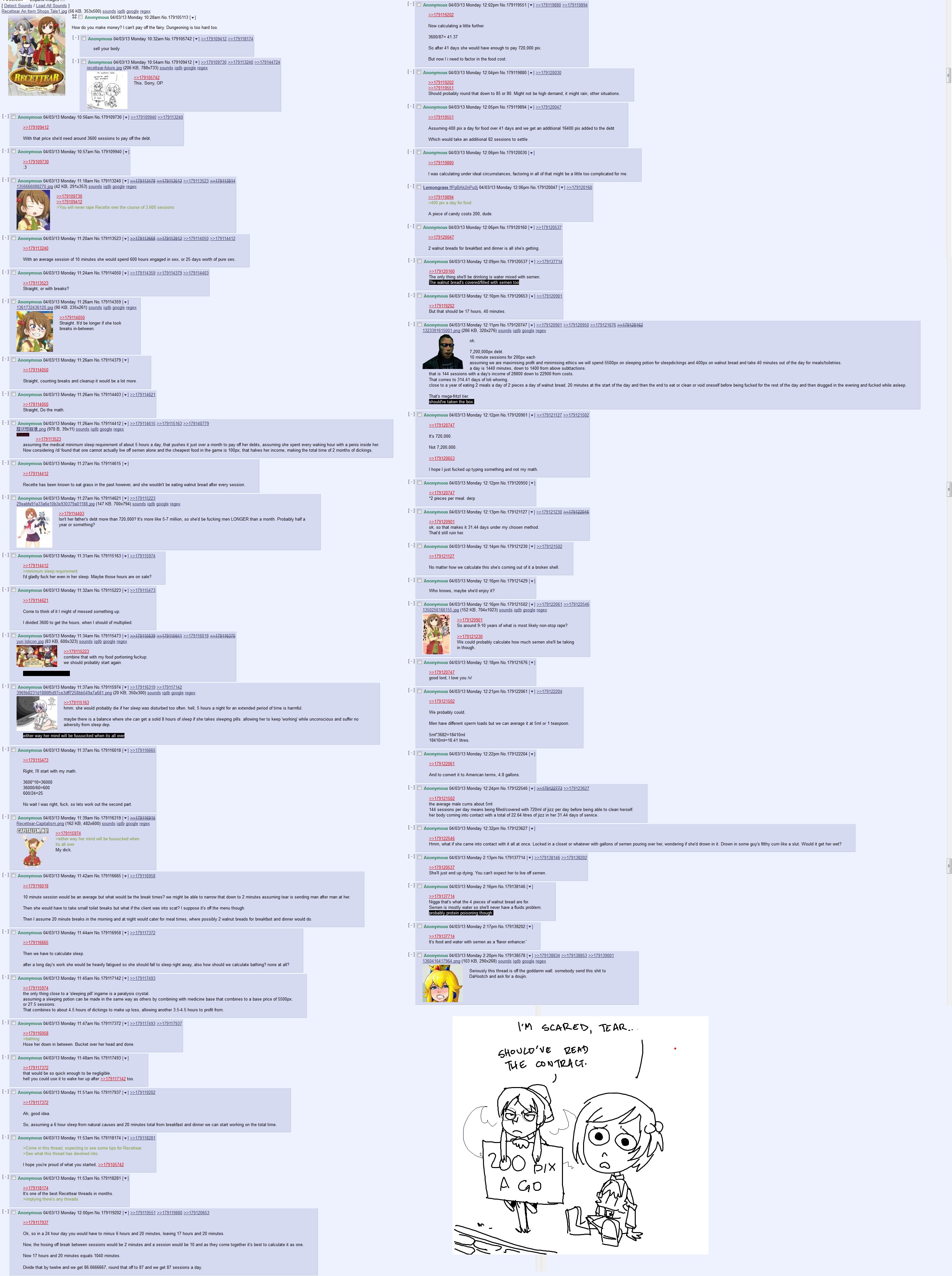 >>728735583>>728726070Oh hey, I was in that thread too. I was also number crunching (and got my numbers wrong). That thread irrevocably changed the way I looked at Recette forever. I still can't look at her without popping a boner.
