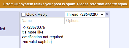 >>728654509It's annoying, but not for the reason the zero iq retards complain about. When I get verificatïon not required, I still have to tab my way to the Post button before I can hit enter. The old captcha just needed the cursor in the captcha field to post.