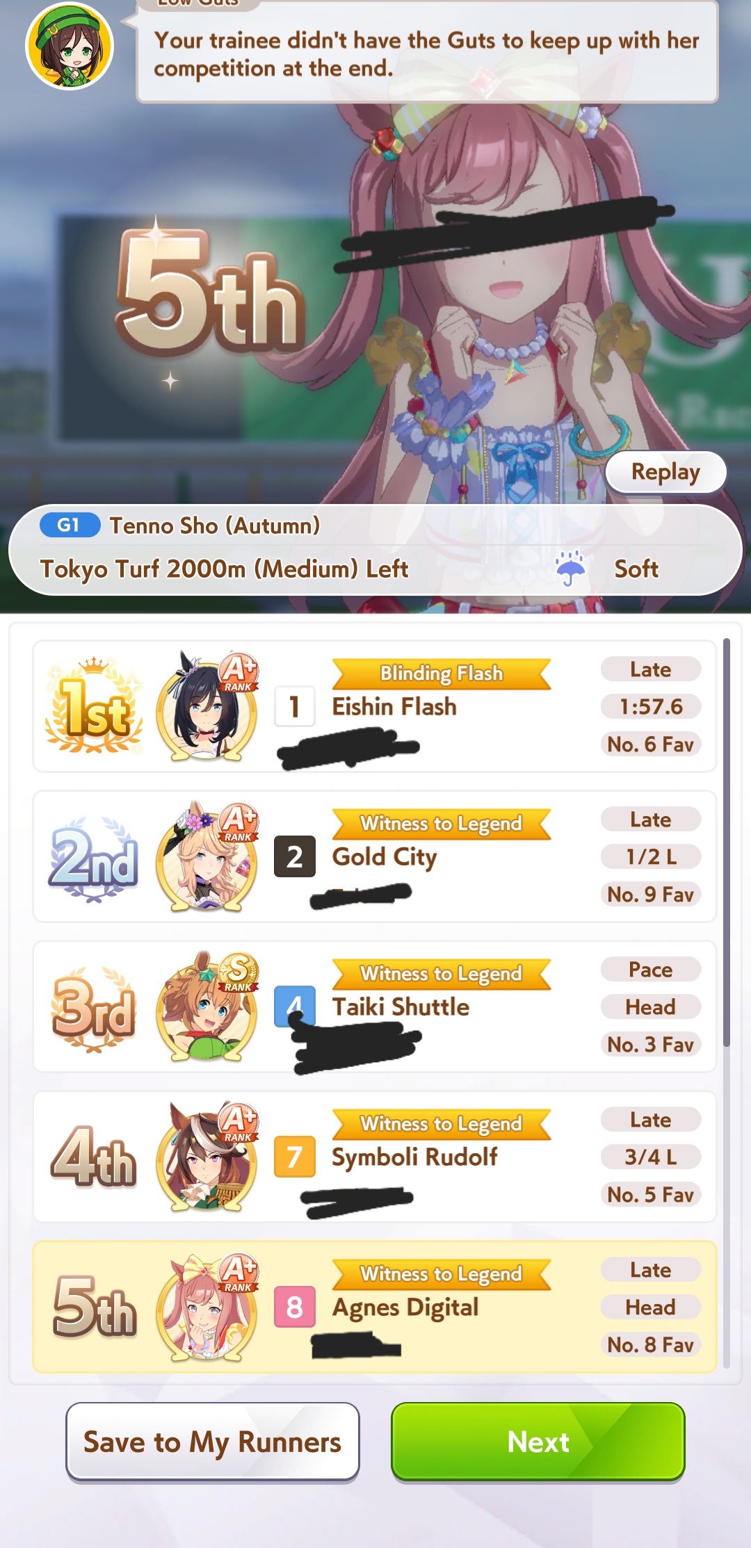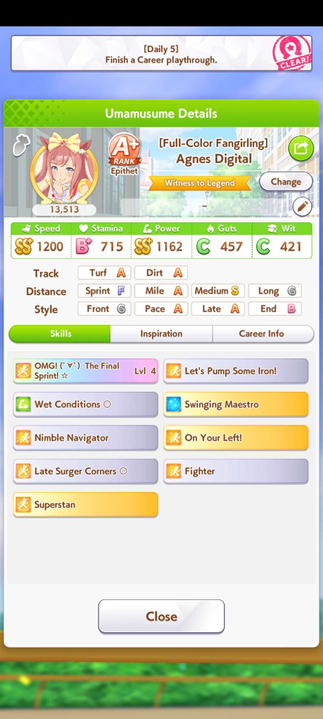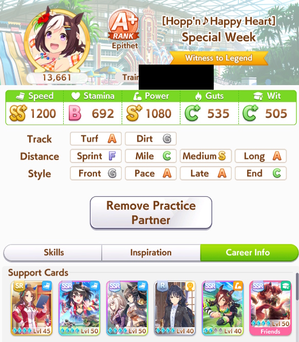 >>728660283I've been memeing graded losers bracket with 1200 800 800 1200 or so I'm gonna retire her and go again with better rng this time, and I have more SSR guts cards now. 5 guts and riko trust the process. What's the distance?