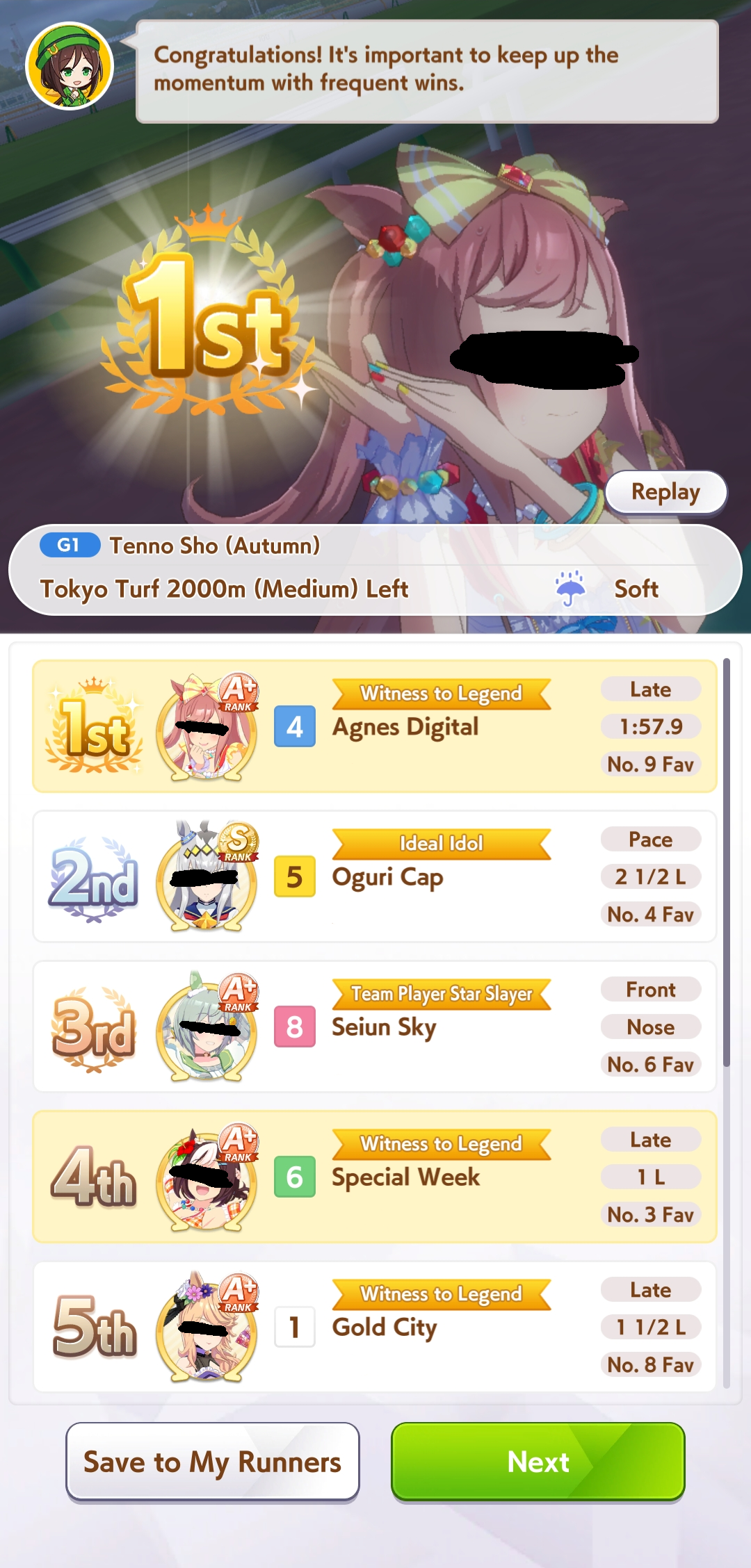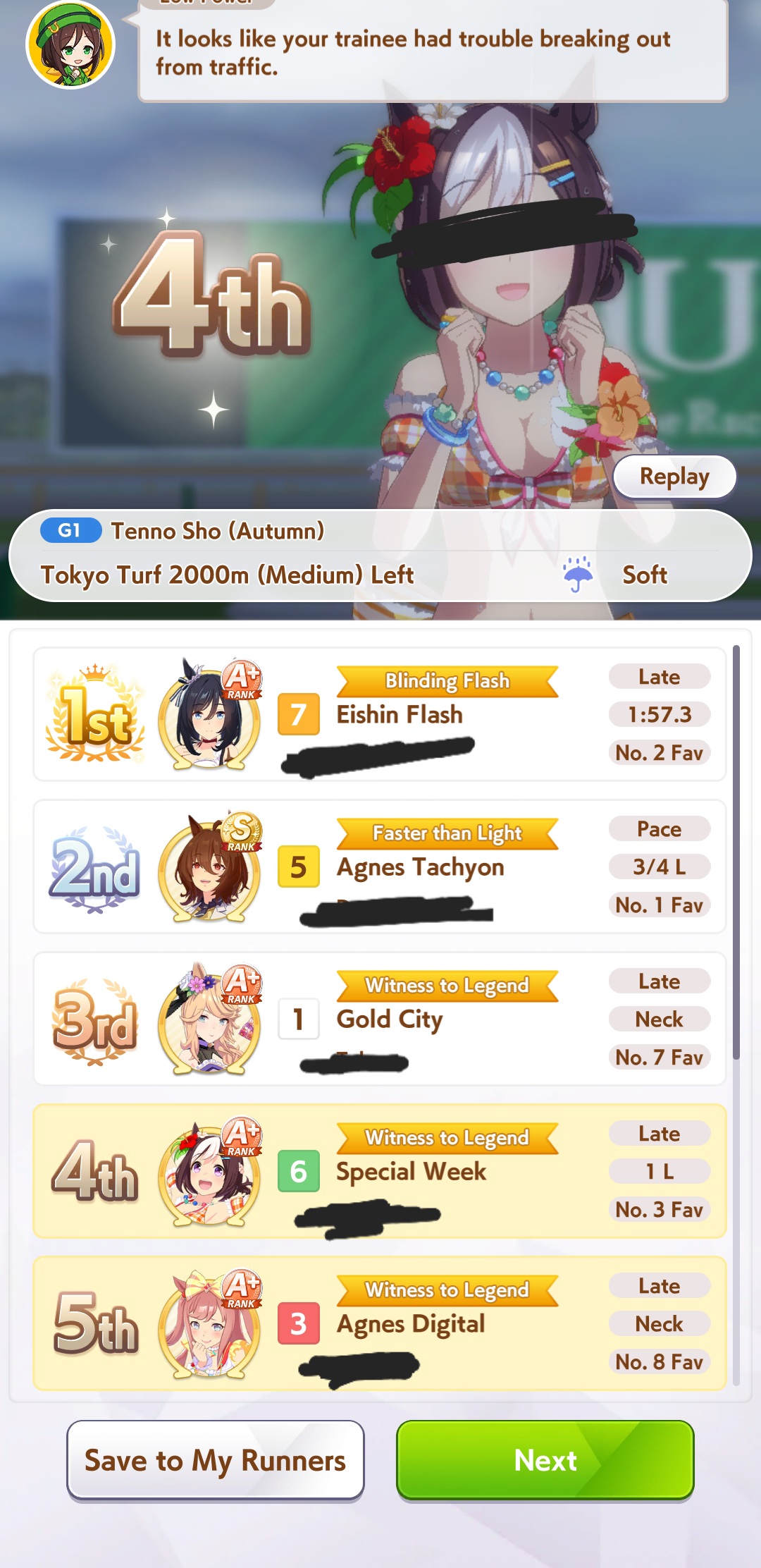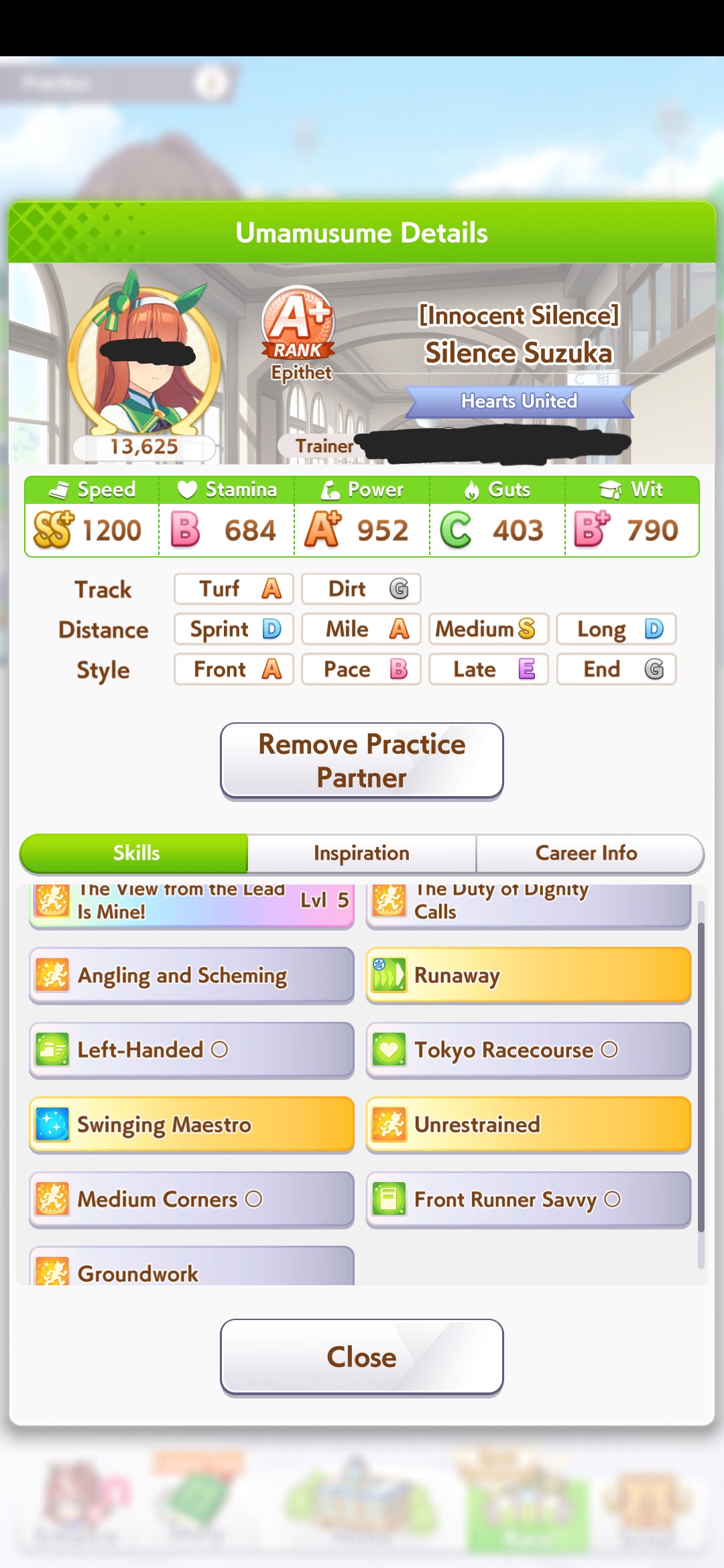 >>728660283I've been memeing graded losers bracket with 1200 800 800 1200 or so I'm gonna retire her and go again with better rng this time, and I have more SSR guts cards now. 5 guts and riko trust the process. What's the distance?