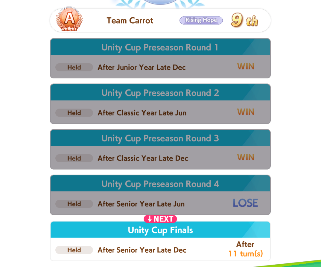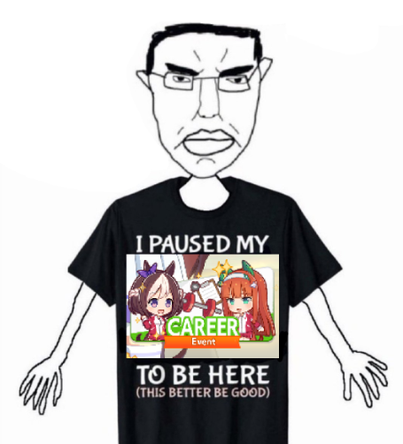 >>728674479>Yeah but they could at least make strong umas with the required statsby rolling enough until they got lucky with a high roll. You say your high rolls aren't that high, that's because you're not getting the HIGH roll, and even then most of the time things don't line up. My "high rolls" are shit because>no distance S>swinging maestro didn't show up>failed Unity finalsetc, all dumb shit due to bad luck. Every single one of my aces has flaws, they arent perfect, but they're still winning because they meet enough of the criteria to beat MOST people (which aren't optimally built). It doesn't have to be the god roll. It just has to be good enough with the right ingredients. Don't need them all even. Just need an *idea* you're going for. Just stop banging your head against the wall and try and remember how to have fun with it. You WILL get the hang of it if you keep trying, but you gotta stop being so harsh on yourself. I know it feels impossible, but I'm telling you it's a frickin' luck game...There might be little things you're doing wrong. But quick key takeaways >always chase after options that give you energy>Always go into summer camp with full energy>Rest when nothing else is looking good or you're below half health>Gamble on the big stat gains even if it's a little dangerousUnity specific:>Prioritize building and popping blue balls immediately, but Guts balls hurt your energy the most>Unity RNG WILL fuck you, sometimes the arrows never line up>Focus on speed rainbows in the senior year, too late to be building up too many balls by then>Always choose the most difficult option for unity races (unless it's looking really bad) Beyond that what else can you do? You can still get screwed by RNG even if 90% of shit goes right. You just gotta keep that in mind. Losing because of bad luck is infuriating, but that's less pressure on yourself and more just due to the games mechanics, so don't need to get so emotionally invested.