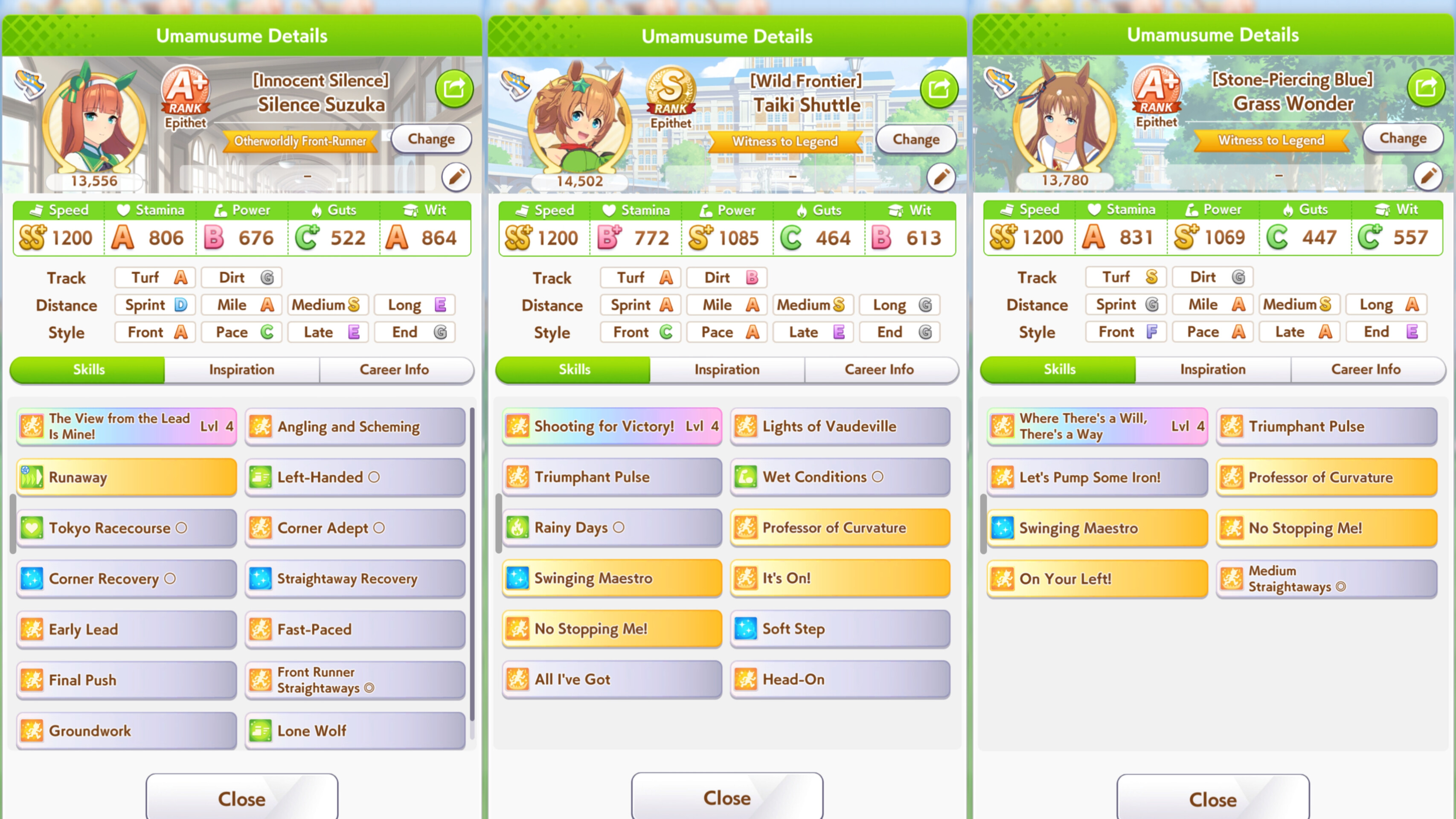 >>728675978You sure are close.The easiest meta team I could think of would be something like>Grass wonder dominator debuffer (late)>Rudolf/alternatively Tachyon dmoinator debuffer (late)>Pace ace - Taiki strong due to innate, plenty of options there like Oguri or whoever really,Just inherit Taiki's ability on your pace + no stopping me and mid race skills.The debuffers can be built as hybrids with stats to win and just throw dominator on + pump iron/no stoping me/on your left etc. Aim for 700-800 stamina + a gold heal, max speed, distance S, decent power otherwise it will be hard to win Graded A. Anywhere that falls short of that will be fine for Graded B.