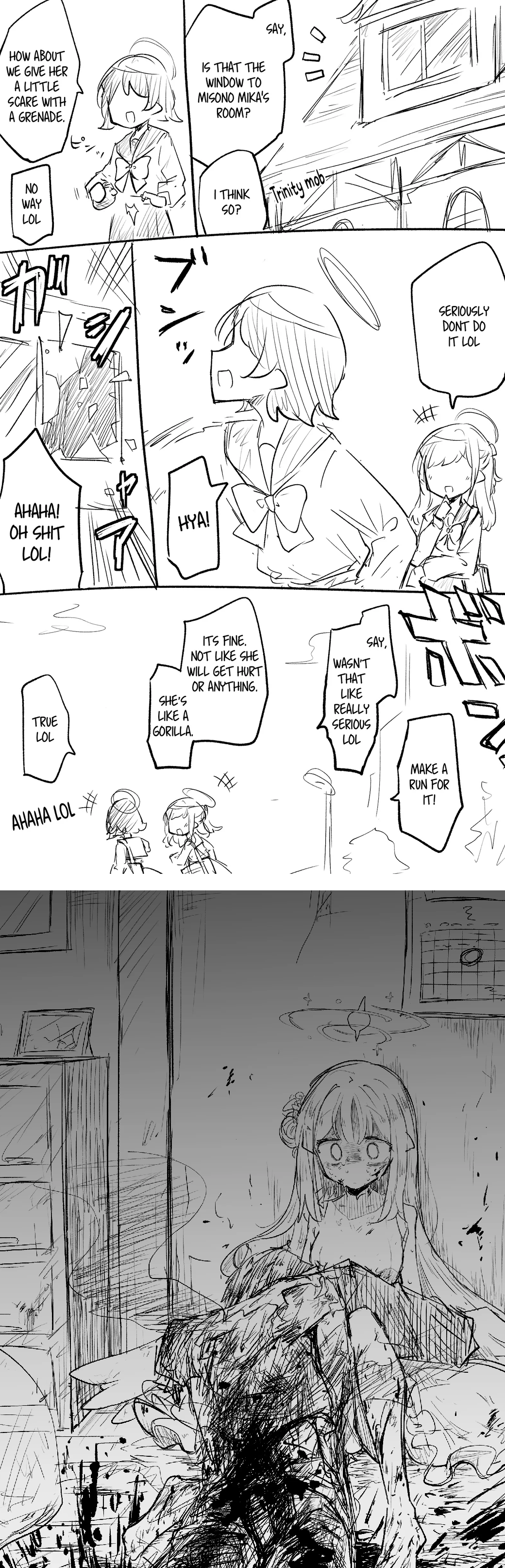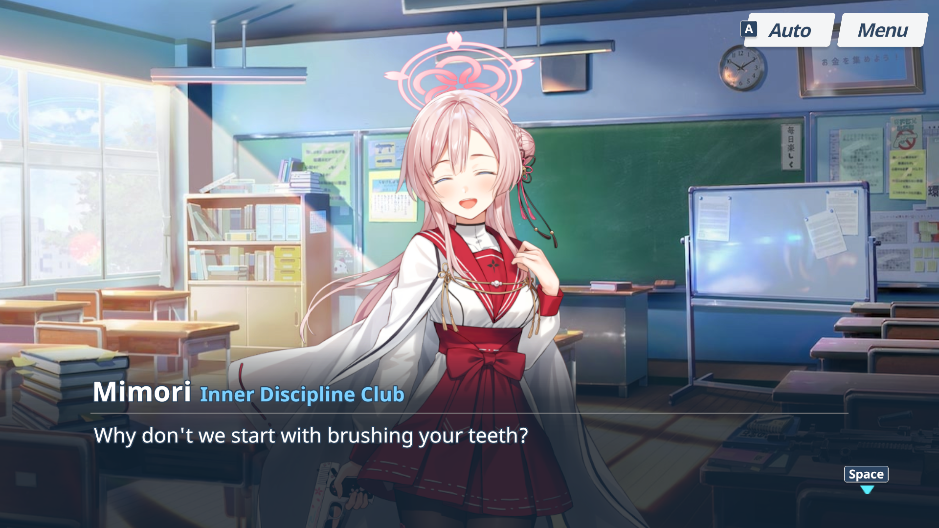Mimori's first momotalk is a bit scary. You wake up at a strange place, and Mimori is there to greet you like it was normal. But her sprite has her casually holding a gun with a smile, it almost feels like she kidnapped you.