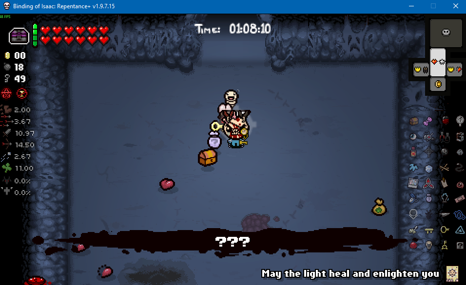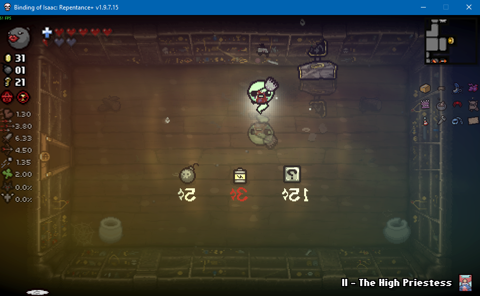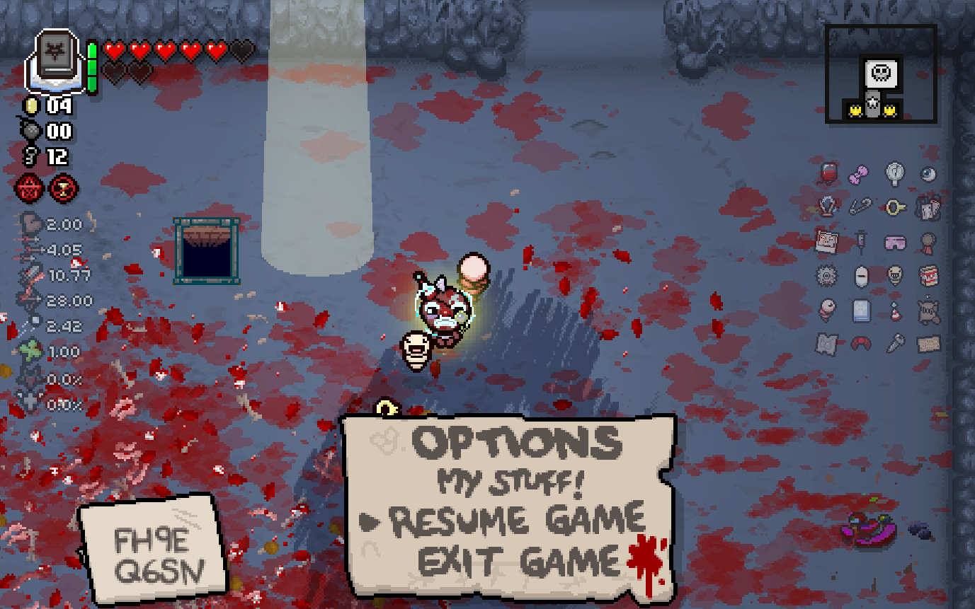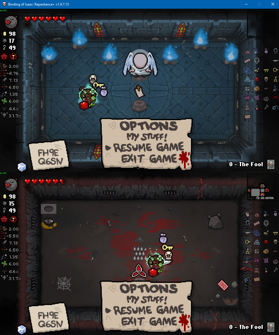 >>728727108Looks like the framerate tanks in large rooms in Dross and is normal in small rooms, guessing it has something to do with the water effects. I'm just going to assume it's the usual Nicalis incompetence.>>728727698There's a lot of ways to minmax shit in Isaac, ends up being a bit time consuming but it's good if you're just looking for a clear. Dross 2 is a great example here, as it has both the boss challenge room along with the reverse floor to net you some extra items. Pic related was empty when I first came in, but it also had an item reroll so I decided to bomb that and see what I get from it (Options? popped out, which is alright but I'm not hurting too much on basic items right now).
