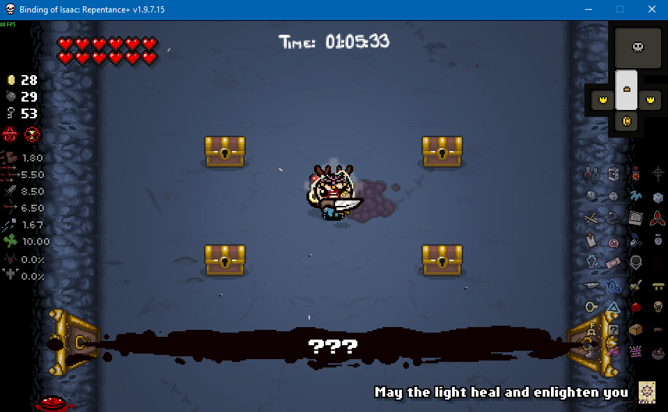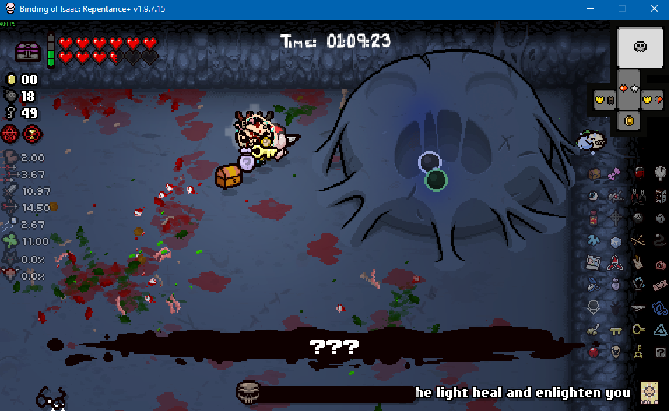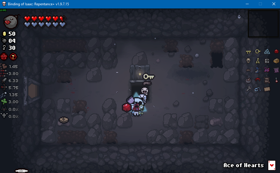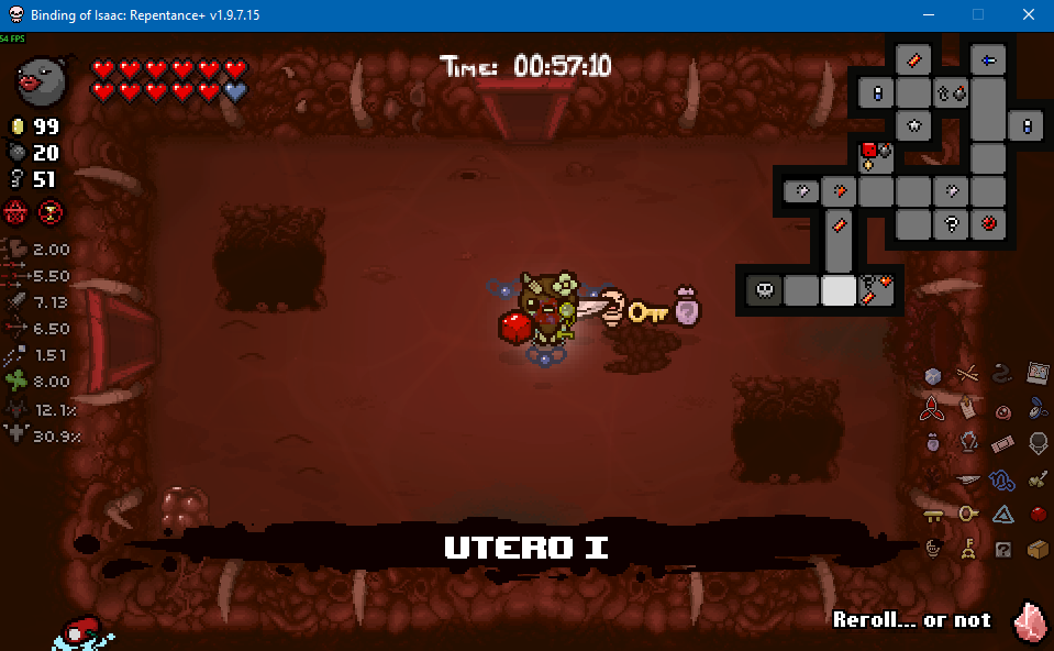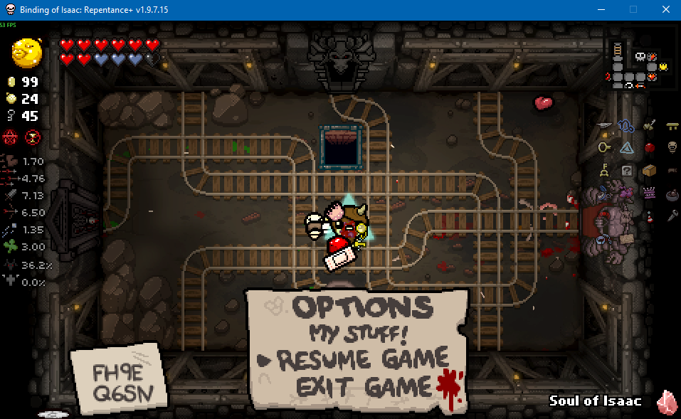 >>728727108Looks like the framerate tanks in large rooms in Dross and is normal in small rooms, guessing it has something to do with the water effects. I'm just going to assume it's the usual Nicalis incompetence.>>728727698There's a lot of ways to minmax shit in Isaac, ends up being a bit time consuming but it's good if you're just looking for a clear. Dross 2 is a great example here, as it has both the boss challenge room along with the reverse floor to net you some extra items. Pic related was empty when I first came in, but it also had an item reroll so I decided to bomb that and see what I get from it (Options? popped out, which is alright but I'm not hurting too much on basic items right now).