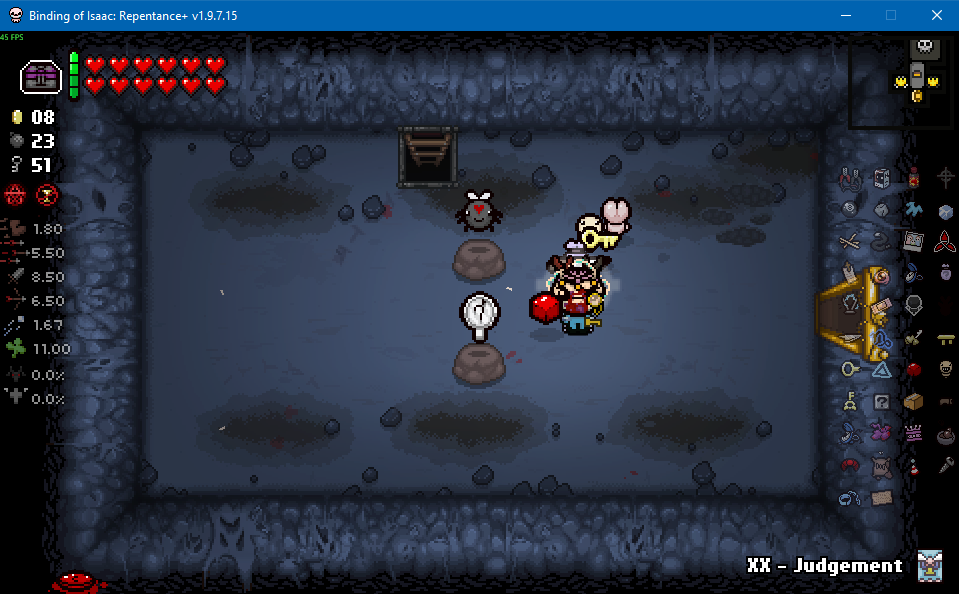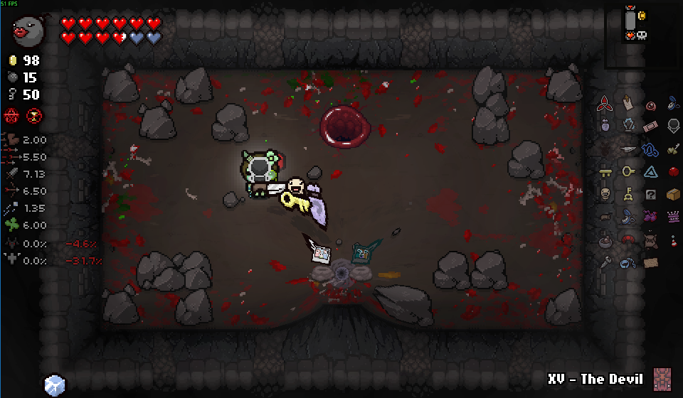 >>728728378Nevermind, the framerate issues are persisting. Either my PC has decided that it's going to start dying on me now, or Nicalis really fucked the game up somehow because I do not remember shit running this slow.Anyways, Sacrifice Rooms are also pretty fucking nice if you can keep your HP high enough/keep enough recovery sources available on the floor if you don't mind backtracking. Notably, you can grab both Key Pieces from here which also boost your chance of Angel Rooms (though I haven't even gotten one to spawn yet, should have done it before doing the boss but oh well), and if you're worried about your damage output against the angels, just keep juking them around the central spikes, they'll kill themselves on it eventually.