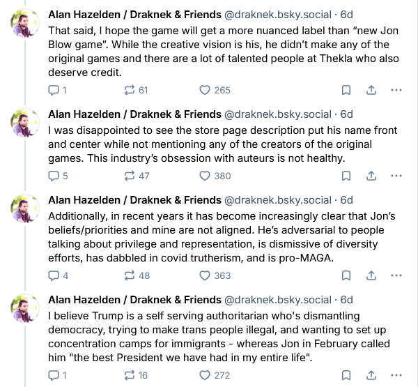 >>728765443His website states that his games were "used as the inspiration and starting point", so I guess this means that he didn't have much to do with the development. At least he promotes OotSS instead of trying to boycott it somehow because he disagrees with Blow politically.