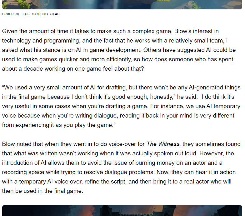 >>728778253shit was a mess. just filled to the brim with awful voice lines.tb h all of the presentational decisions here are bad.the name is bad, the art style is middling, the concept art looks like it's for a mobile game.i don't know if anyone under the age of 35 even knows who jon blow is - if i didn't know about the witness i'd look at that trailer during the game awards and think this was a mobile game.
