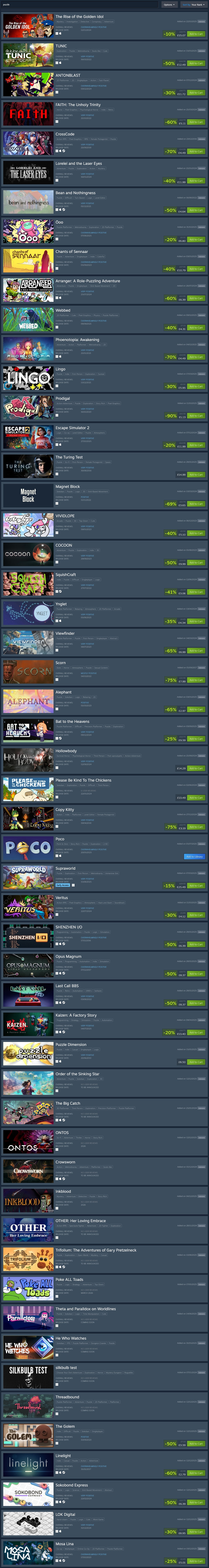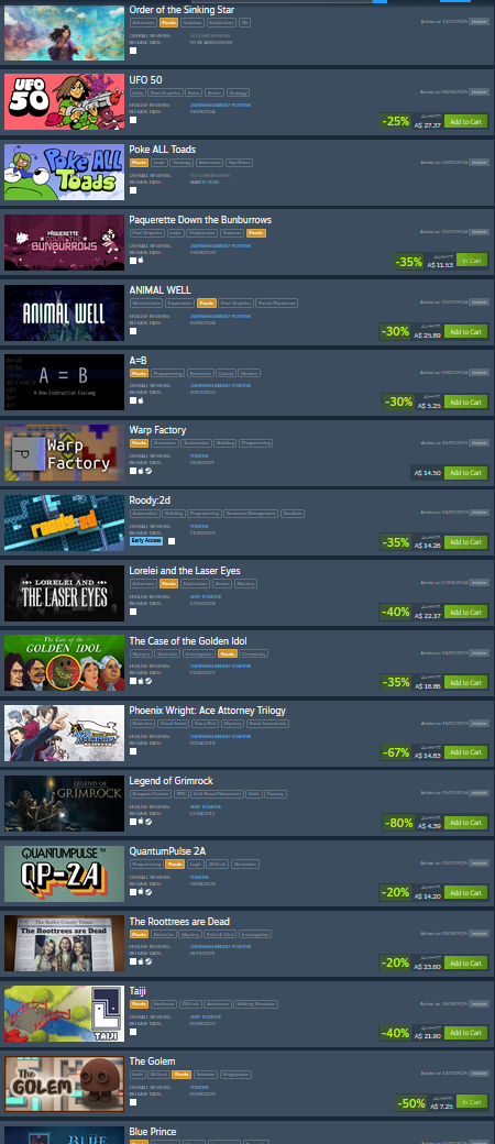 I fucking hate the witness I wanted to like it and then realized every set of puzzles was gonna be some "you gotta look at a glare or reflection at a specific angle to get spoonfed the solution and this is the only way to solve it"sorry but that's not puzzling that's pixelhunting, it's antithesis to the concept of "a puzzle" a puzzle lays practical simplicities in front of you and forces you to reconceptualize their configuration, the witness has you observe the environment for ever abstracting keys. That's what's called a fucking scavenger hunt. There's no out of the box thinking or working with what you have it's just moving the camera around until you stumble upon the answers.Anyway this new game looks great, 4 simple yet deceptively complex puzzles and we will see their concepts blended and increase in complexity as it continues. Seems like he saw a real puzzle game like Baba and completely shit his pants, decided to stop being a fraud.