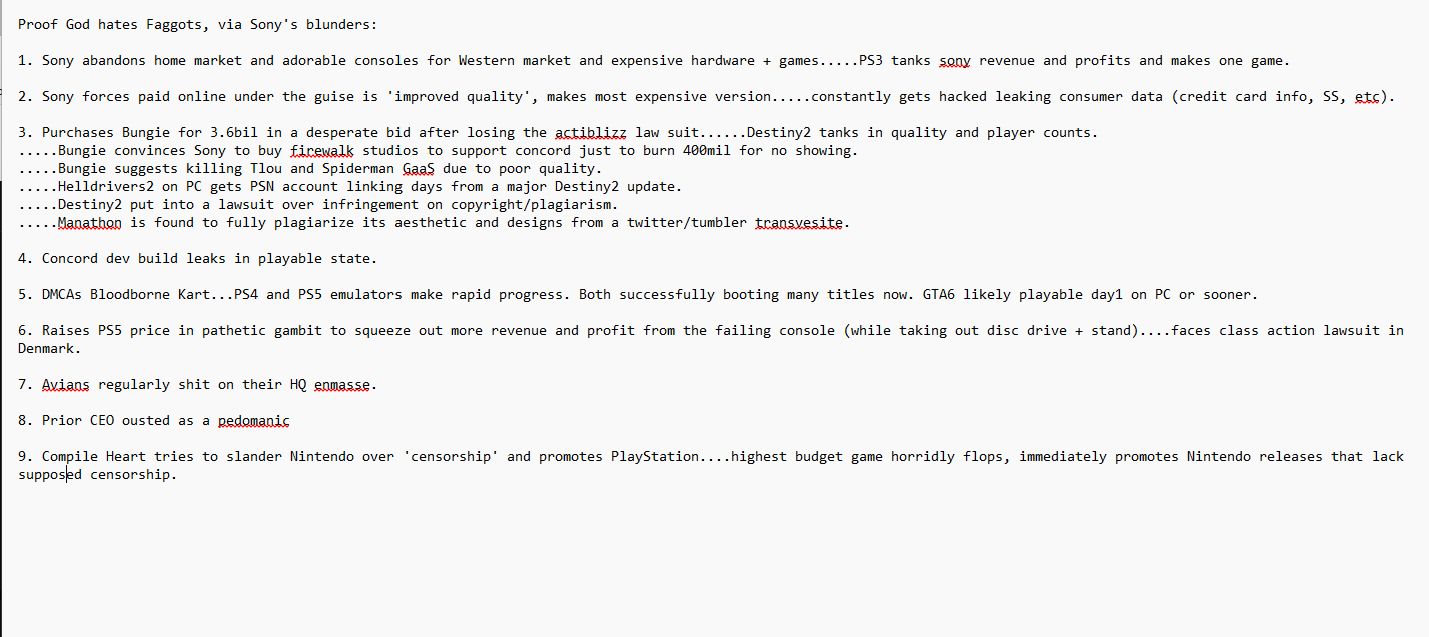 >>728831835everything.Thursdays are always bad for sony.intergalactic (the space dyke nigger game) is in massive crunch....for an INTERNAL demo to show sony big wigs.sucker punch lost their ceosquare investor called tjem out on being massive faggotsterribly embarrassing holiday ad>>72882938028/30 again.sony film studios bought The Peanuts ip rights (charlie brown) for $457mil>>728827330etc