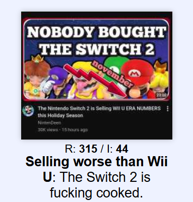 >>728824351The views right now are in shitting on Nintendo because the content creators don't have any games to milk for content like they could with something like TotK. MKW's patch removing the random 3 lap track trick made a lot of people lose interest so the views aren't there for regular content so people make grifting content right now instead. Nintendo is releasing a lot of niche games instead of a flagship game so content creators can't really get views for doing Kirby Air Riders videos or Zelda Musou videos and even DK is a niche IP compared to the heavy hitters. ZA is the only game they can remotely farm videos with and the reception to ZA in the west was not great and it's a spinoff so the core turn based fans aren't as receptive to it either. Grifting will stop as soon as there's some big new game to farm videos with but there's none of those on the horizon right now.