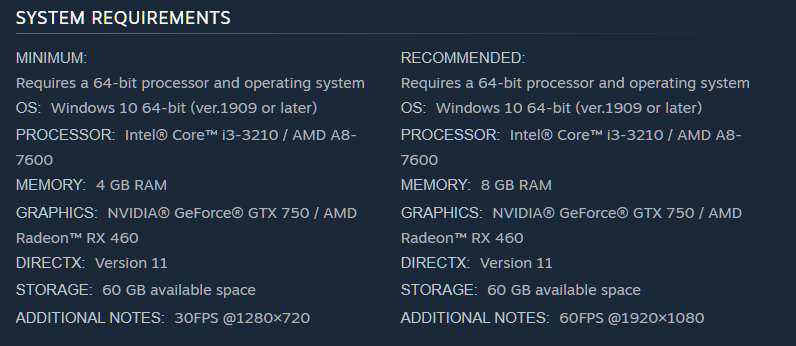>>728831843Nah that wasn't it. It was RAM bottleneck due to their dogshit porting coding to get around their already dogshit PS3 coding. Switch 1 only has 3GB of ram usable for games but KH collection requires 4GB RAM to run at 720p30 and 8GB RAM to run at 1080p60 on Steam. The required specs are the same minus the ram. 4GB to run at 720p30 means that KH1 and KH2 would have run at SD resolutions in docked and like 360p in handheld lol