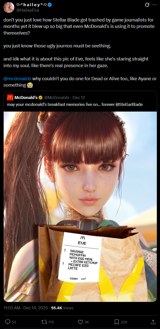 >>728866398>>728866430Lads I’m not being funny but stellar blade was nominated for a couple categories at TGA last year. If a game has enough popularity in the gaming space to be considered for awards in that show, it’s normalfag core