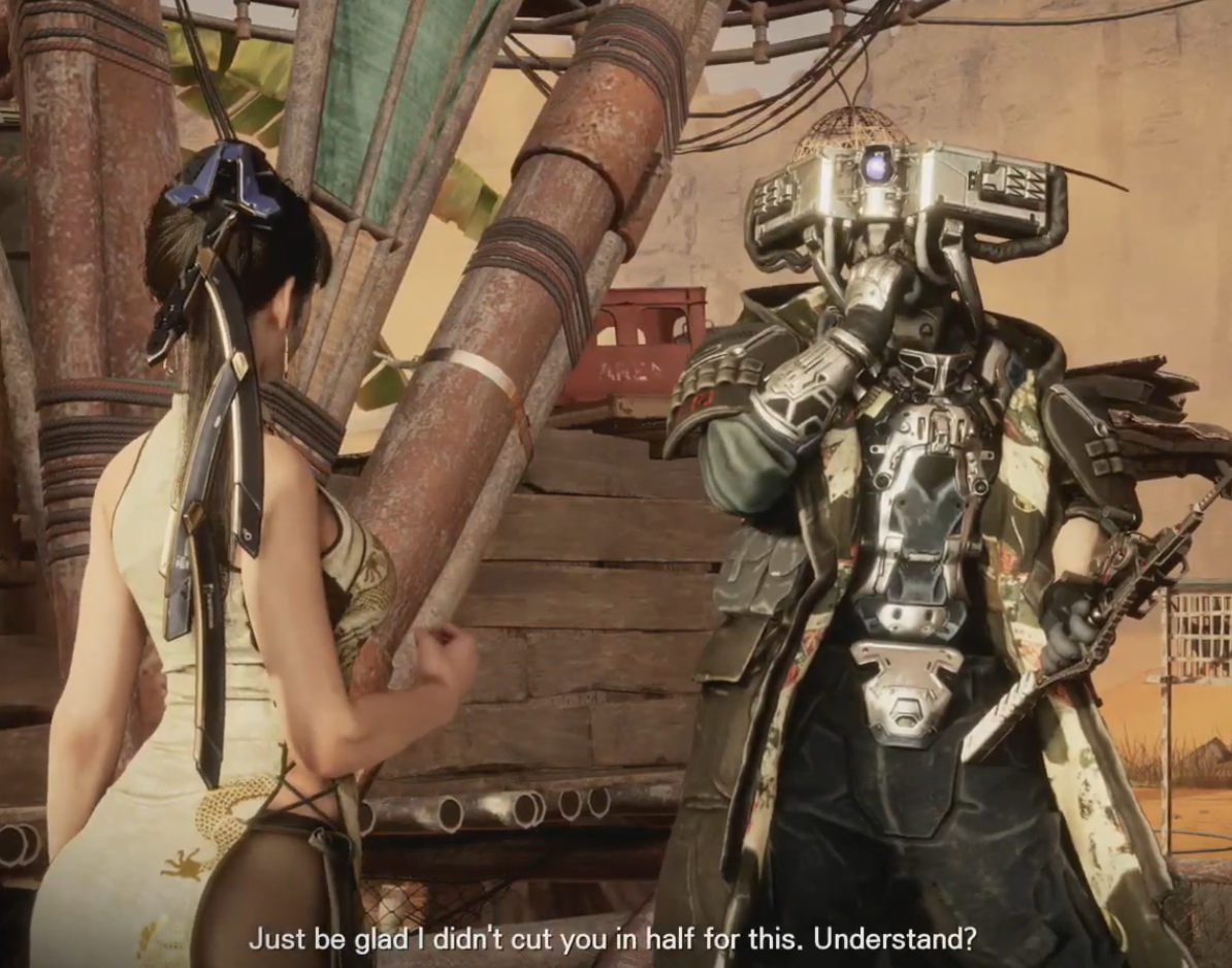 >>>728910776Imagine having your dev team compose a shot like this and make it completely non-sexual. Even after they take her captive in a seedy warehouse their no hint of lust from them at all. It's like if a beautiful and buxom ladyknight was defeated and captured by a gang of brutish bandits who planned to sell her armor and keep her around to clean their boots and nothing else.