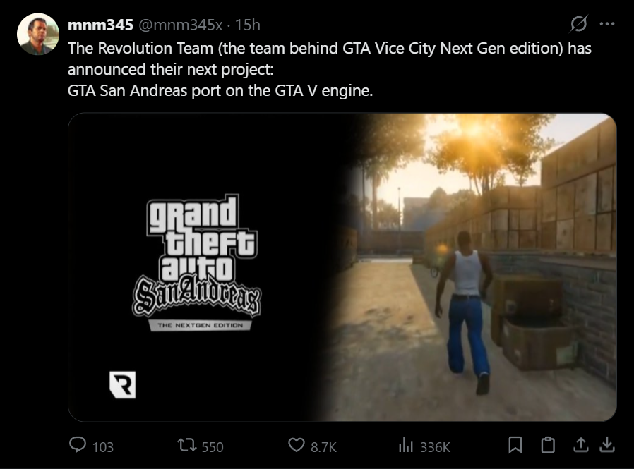 Team of modders behind the total conversion mod of GTA Vice City for GTA IV version of rage engine that released at the very end of January of this year despite much pushback from TakeTwo has now announced that they are actively working on the unofficial port of GTA San Andreas into rage engine from GTA V.